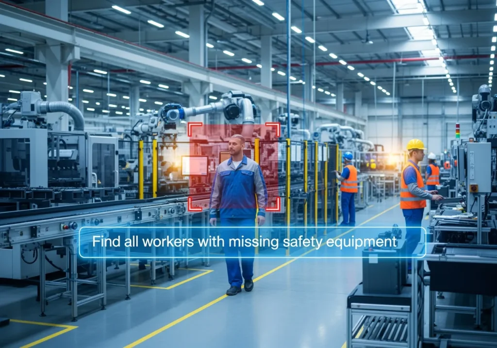 Natural Language Querying: Search live or recorded feeds using prompts like ‘Locate any technician without a helmet near the furnace in the past 24 hours’.